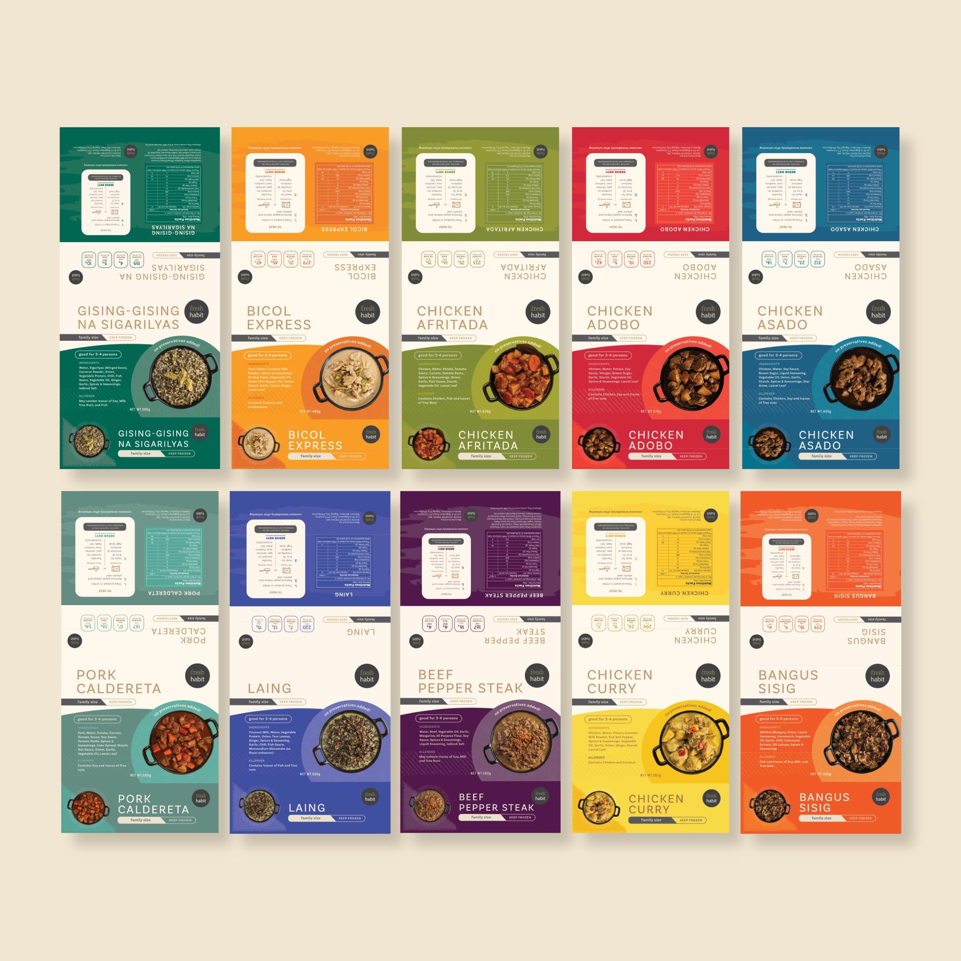 Packaging design for a line of 10 ready-to-heat frozen meals.