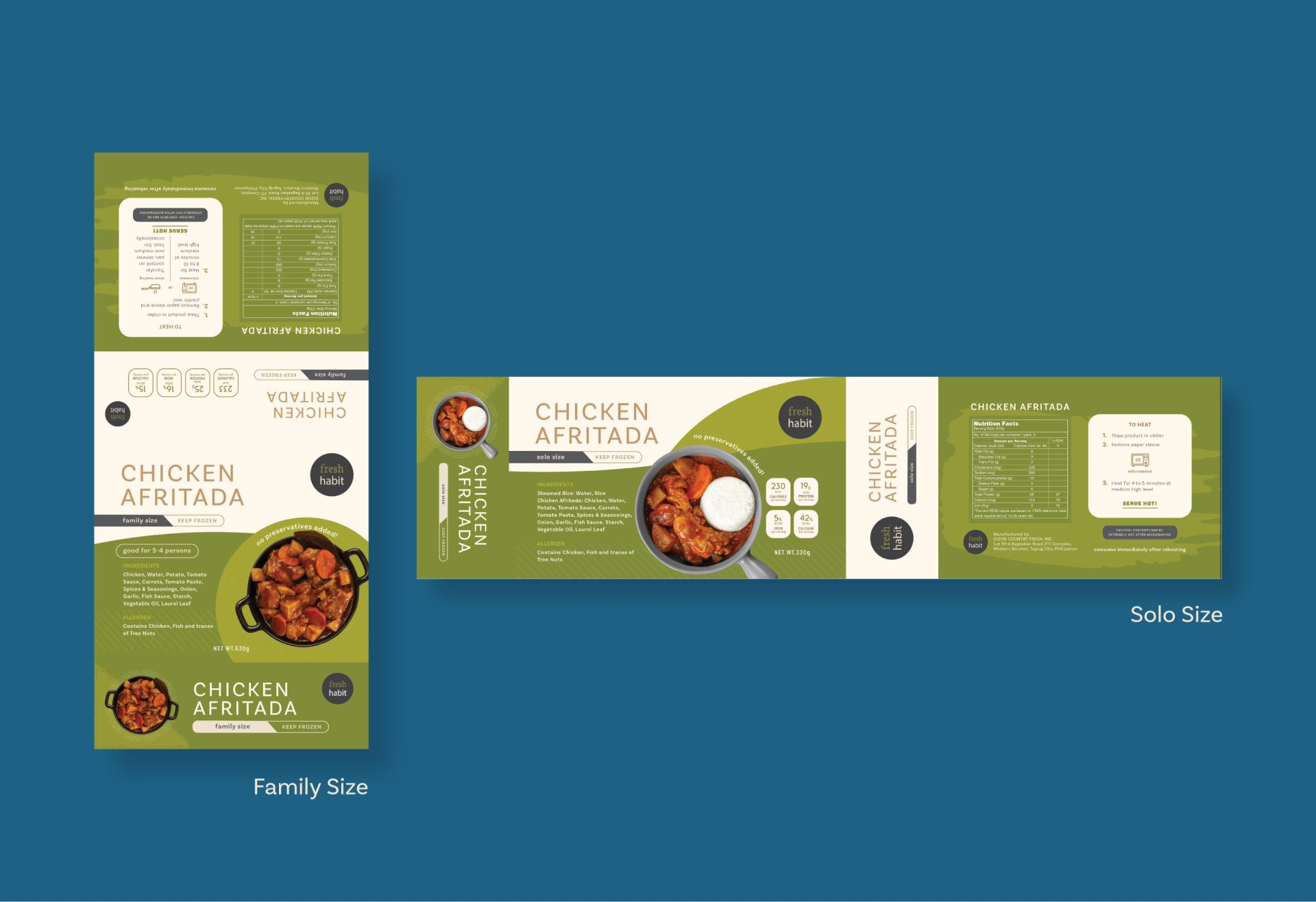 Each dish was assigned a distinct color to easily differentiate variants, with a consistent layout system tying the range together. Solo and family packs were designed in parallel, ensuring consistency while addressing different formats. I also photographed each dish, providing two unique product shots per variant to feature on the packaging. Final printing and production were managed by the brand’s in-house team.